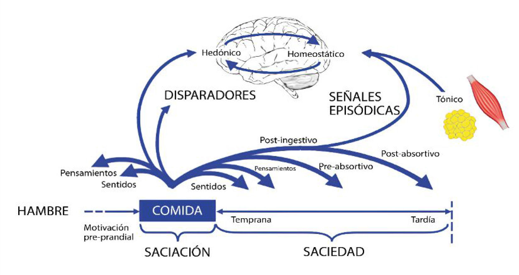 El hambre es un impulso para la ingesta de alimentos, lo que desencadena una serie de señales, las cuales terminan la ingesta de alimentos (saciación) y conduce a la suspensión del hambre después de la comida (saciedad). Estos procesos homeostáticos interactúan con procesos hedónicos en el control general del apetito e ingesta de alimentos. Adaptado de Blundell y Finlayson (2008). Con permiso del autor.