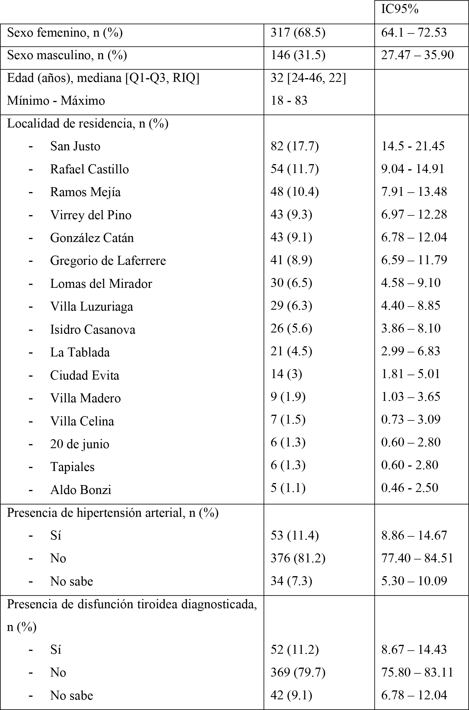 Métodos: Estudio descriptivo transversal realizado en 2024-2025 a 463 personas adultas residentes en La Matanza. Se aplicaron encuestas estructuradas sobre hábitos de consumo de sal y antecedentes de salud y se realizó el análisis del contenido de yodo en 20 muestras de sal comercial mediante titulación redox indirecta.