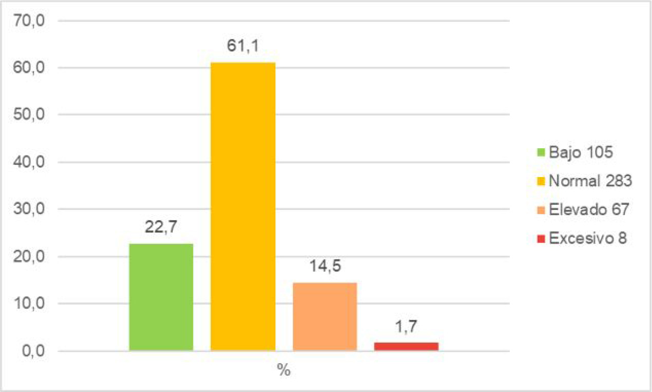 | Gráfico 1: Porcentaje de la muestra estudiada según autopercepción del consumo de sal (n=463)