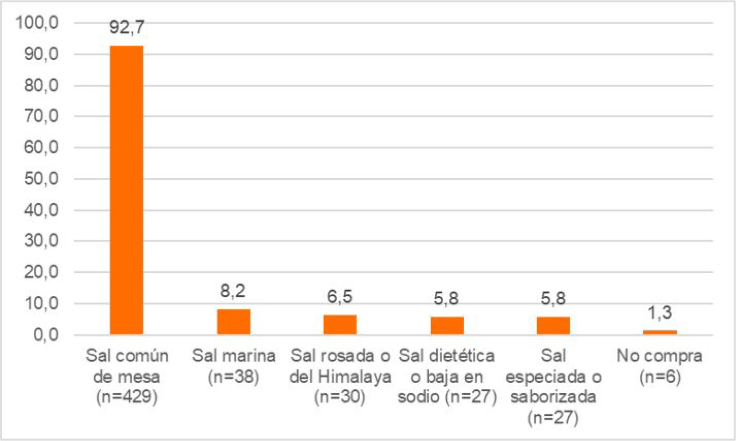 El 98.7% de la muestra refirió comprar sales habitualmente. El lugar más elegido para la compra fue el supermercado (83.3%), seguido del almacén de barrio (36.5%). La compra en dietéticas fue menos prevalente (5.2%) y solo una persona en la muestra refirió acudir a ferias barriales.