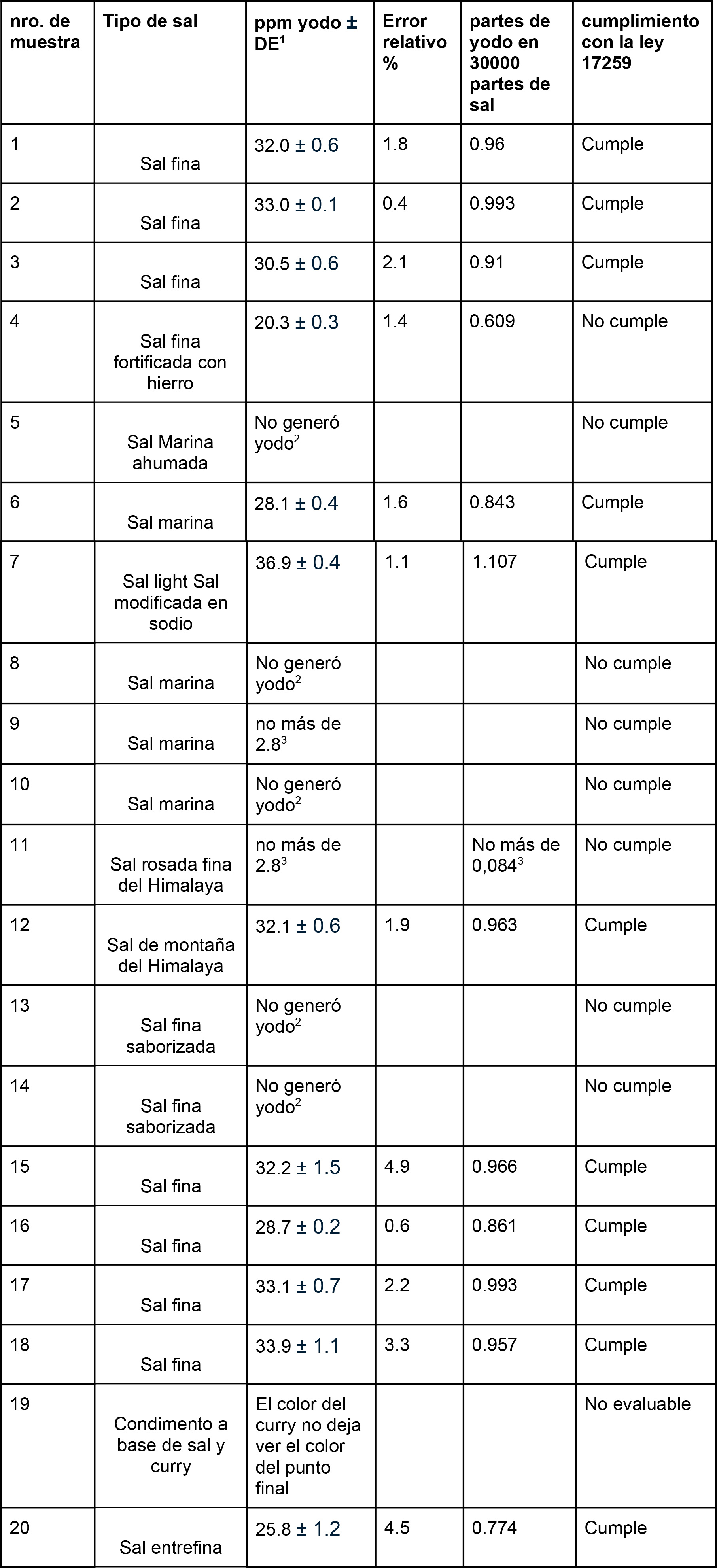 De las sales evaluadas, 8 de 19 no alcanzan el valor mínimo de yodo estipulado en la Ley 17259 de yodación de sal, es decir que el 42.1% de las sales muestreadas no aportan yodo o no están suficientemente yodadas (una sal fortificada con hierro, una rosada, 4 sales marinas y dos sales saborizadas). Una de las sales marinas que no generó yodo, poseía la leyenda de yodación en el envase. Todas las muestras de sal fina advertían estar fortificadas por ley y cumplieron con el nivel de yodación.